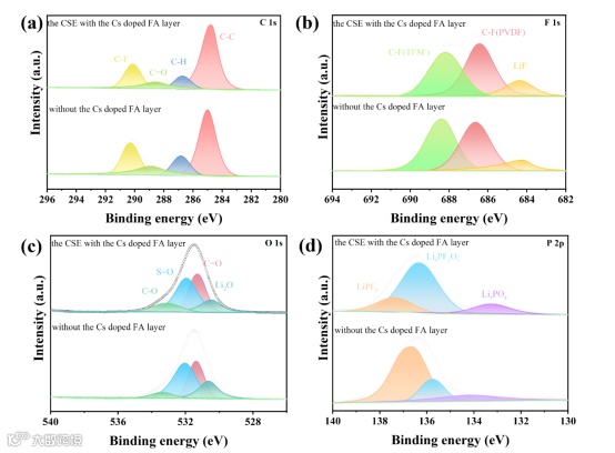 为了进一步探索Cs掺杂FA界面层对锂枝晶生长和SEI组分的影响,利用扫面电镜证明了界面层可以诱导锂离子均匀沉积。并且XPS结果也表明该界面层可以在锂金属和电解质界面之间形成以LiF为主的多种SEI组分,这对于锂金属的均匀沉积起到了重要的作用。
