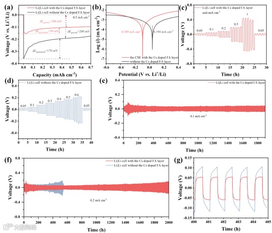 成核过电位和Tafel曲线表明Cs掺杂FA界面层的引入降低了局部电流密度,使锂离子很容易迁移到锂金属阳极表面,进而加快了Li+在锂金属阳极和电解质之间的界面上的动力学过程。同时锂对称电池也表明Cs掺杂FA界面层的引入可以提高锂金属阳极和电解质之间的稳定性。