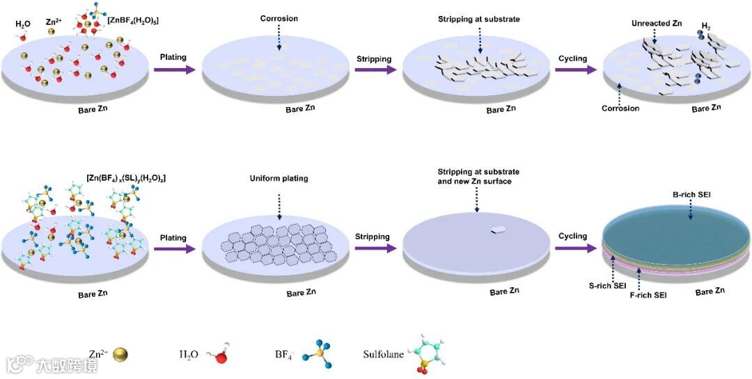 图1. Zn(BF4)2基水系电解液和水合共晶电解液中Zn2+溶剂化结构及循环过程中相应界面特征的示意图。