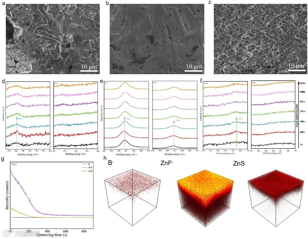 Zn||Zn对称电池循环后的SEM图证明锌电极在合适配比的Zn(BF4)2/SL/H2O共晶电解液中表面更加平整,证明由水引发的副反应和游离的四氟硼酸根离子水解造成的腐蚀在该电解液中得以有效抑制。随后,采用XPS溅射和3D TOF-SIMS对锌电极的表面成分进行分析。测试结果表明,循环后锌电极表面形成具有梯度结构的SEI,其中富含B的化合物和ZnS主要分布在外层,而ZnF2则分布在整个内外层,其含量随着SEI深度的增加逐渐减少。XPS和ToF-SIMS表征证实,这种具有梯度结构的稳固SEI有效隔绝了锌电极与电解液之间的直接接触,促进了锌的均匀沉积,可以有效提高锌电极的可逆性。