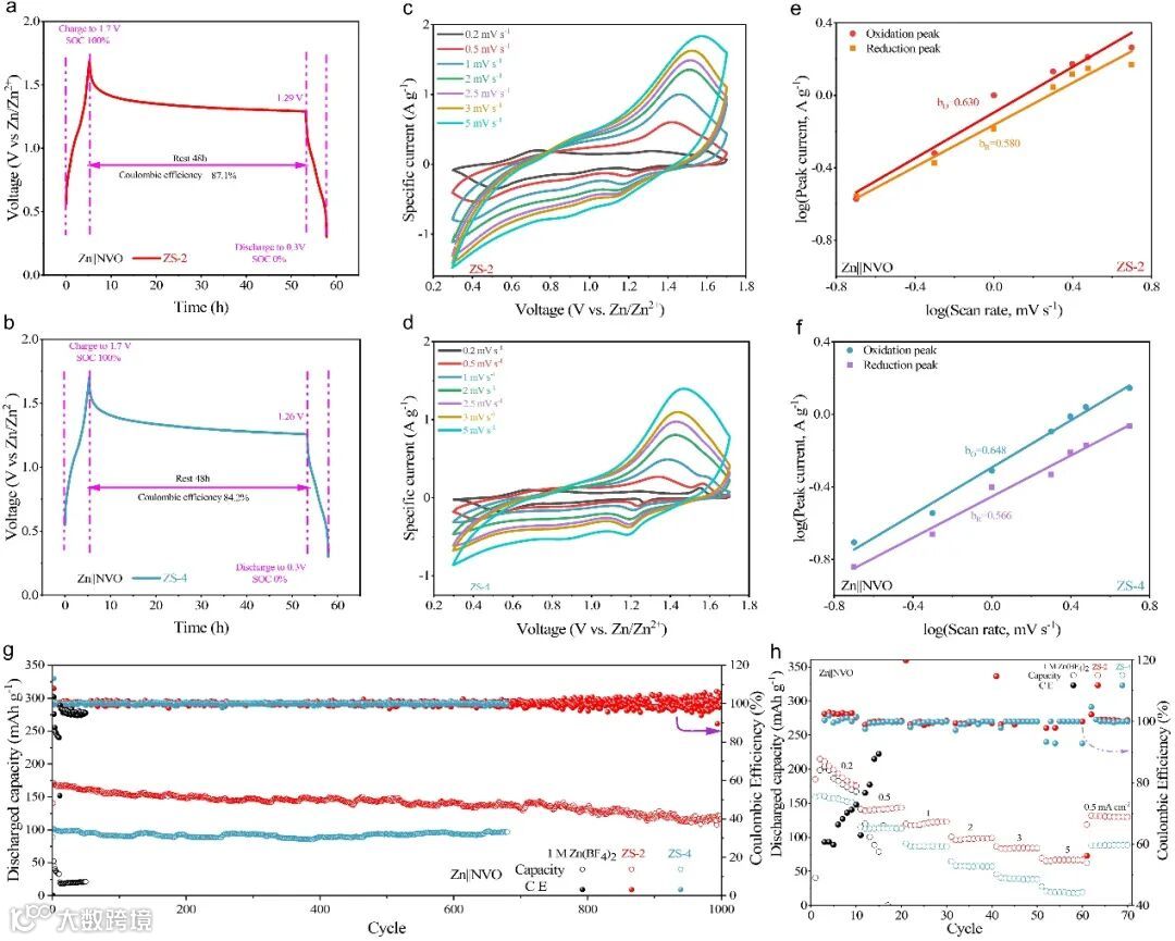 基于Zn(BF4)2/SL/H2O共晶电解液的Zn||NH4V4O10全电池展现了优良的循环性能,循环1000圈后,全电池容量保持率仍高达83.4%。此外,得益于SEI的作用,全电池的自放电现象得以有效抑制。