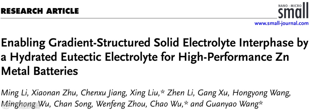 近日,来自上海大学的王官耀、刘星副研究员与上海理工大学的吴超教授合作,在国际知名期刊Small上发表题为“Enabling Gradient-Structured Solid Electrolyte Interphase by a Hydrated Eutectic Electrolyte for High-Performance Zn Metal Batteries”的研究论文。该论文设计了由水合四氟硼酸锌盐(Zn(BF4)2·xH2O)和环丁砜(SL)构成的新型水合共晶电解液,不仅抑制了四氟硼酸根离子在常规水溶液体系的强水解现象,实现了Zn(BF4)2基电解质与新金属负极之间的兼容性问题;还通过SL的引入,构建了新的Zn2+溶剂化鞘,原位形成具有梯度结构的理想SEI,为锌金属负极提供了充分的保护。
