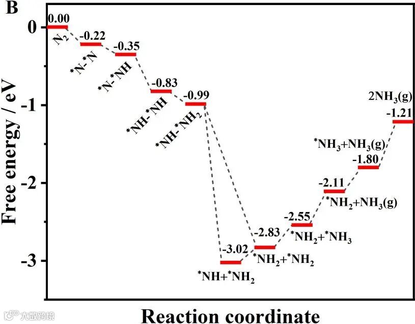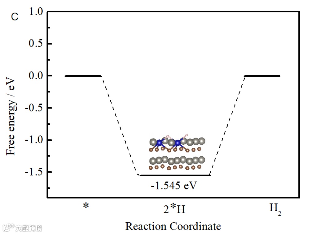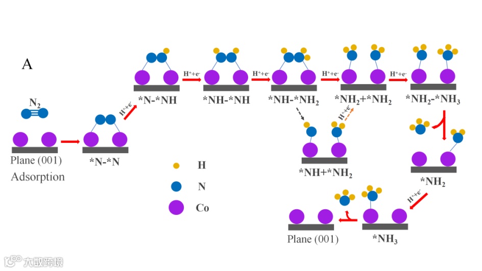 图6. N2分子在(001)面钴原子活性位点上的桥联吸附(A);桥联吸附产生酶催化机理(B); 氢原子在(001)面钴原子上产生一个强吸附,导致需要一个较大的活化能才能析氢,因此析氢反应得到了有效抑制(C)。