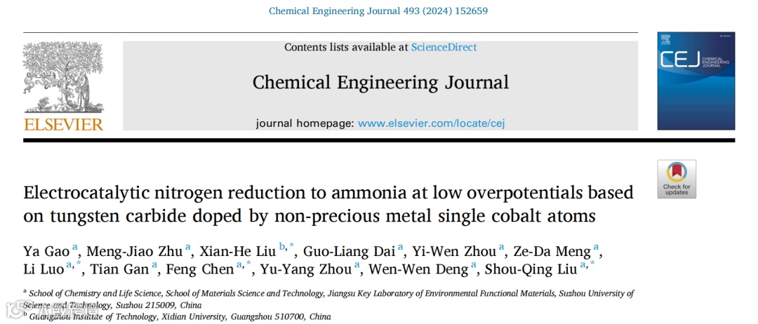 氮气转化为氨在可持续的能源储备、化肥生产中具有重要意义;高纯氨在现代半导体工业比如氮化镓的制备中具有重要意义。然而,传统Haber-Bosch法合成氨释放大量温室气体,利用绿电合成绿氨既可避免温室气体的排放,又可将绿电存储为绿氨,实现可再生能源的循环利用。电催化氮还原(NRR)合成氨过程中,析氢反应(HER)是氮还原反应的竞争反应,如何在低过电位条件下电催化还原氮气合成氨则是本领域需要解决的技术难题。本文展示了非贵金属钴单原子掺杂碳化钨的制备方法,优化了组成,在-0.10V vs RHE电位条件下将氮气电催化还原成为氨,用VASP法计算了反应机理。本文为设计低过电位电催化剂提供了新思路。