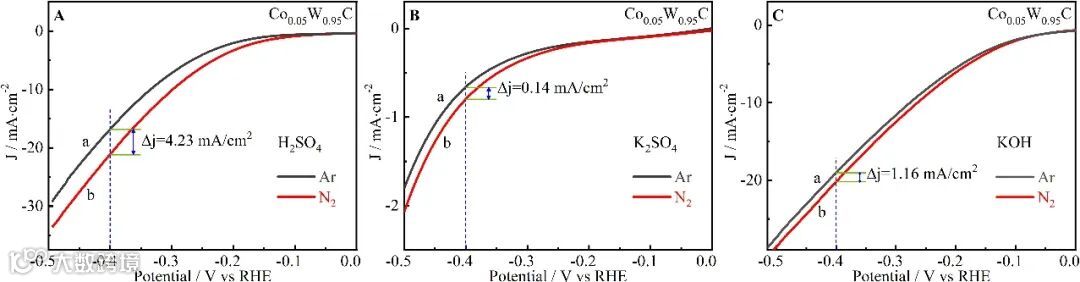 分别在0.1mol/L的H2SO4、K2SO4和 KOH溶液中的线性扫描伏安曲线显示,Co0.05W0.95C在酸性介质中有最大的还原电流。如图4所示,在H2SO4溶液中,NRR的还原电流增加了4.23mA/cm2,而在中性和碱性溶液中仅增加0.14mA/cm2和1.16mA/cm2.