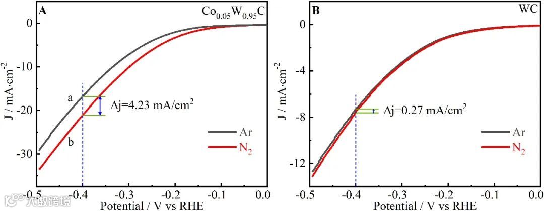 图1. Co0.05W0.95C (A)和WC(B)电催化材料分别在氩气饱和(a)和氮气饱和(b)的 0.10 mol/L H2SO4中的线性扫描伏安曲线。