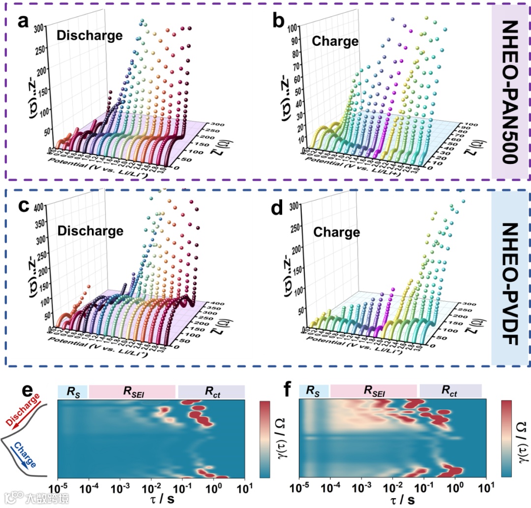 图5. (a-d) 原位EIS三维数据图,以及从NHEO-PAN500 (e) 和NHEO-PVDF (f) 的原位EIS中计算得到的DRT图。