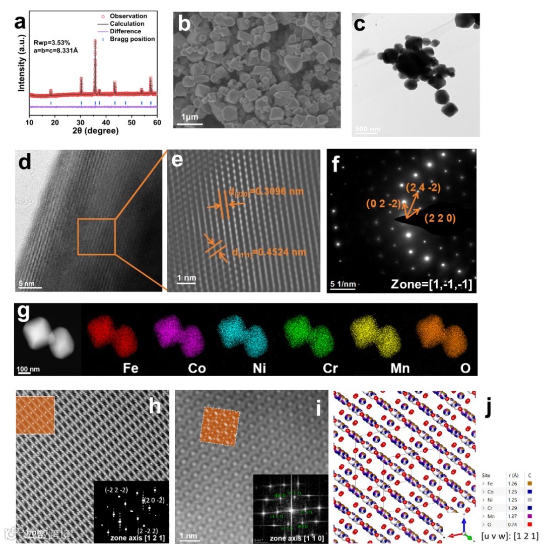图1. NHEO的结构表征。(a) XRD图谱。(b)SEM图像。(c)TEM图像。(d, e)HRTEM图像。(f) SAED图像。(g) STEM-HAADF图像及相应的元素映射图像。沿区域轴(h) [1 2 1]和(i) [1 1 0]的原子分辨率高角环形暗场扫描透射电子显微镜(HAADF STEM)图像,其快速傅里叶变换(FFT)图像插入在右下角。左上角的橙色区域是模拟的原子分辨率下的晶格局部结构。(j) 沿NHEO区域轴[1 2 1]的晶体结构模型。