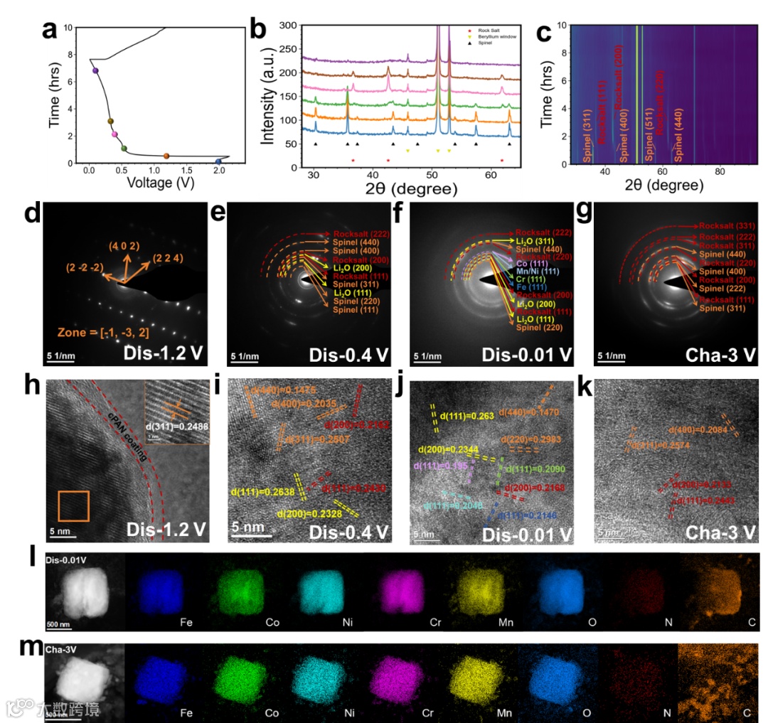 图6. (a) 充放电曲线,(b) 1 mA g-1电流密度下NHEO-PAN500电极在第一循环中对应电压下的原位XRD图谱,以及(c) 对应的等高线图。(d-g) SAED图谱,(h-k) 不同电压下的HRTEM图像。(l, m) NHEO-PAN500在完全放电/充电状态下的STEM HAADF像及其对应的EDS数据。
