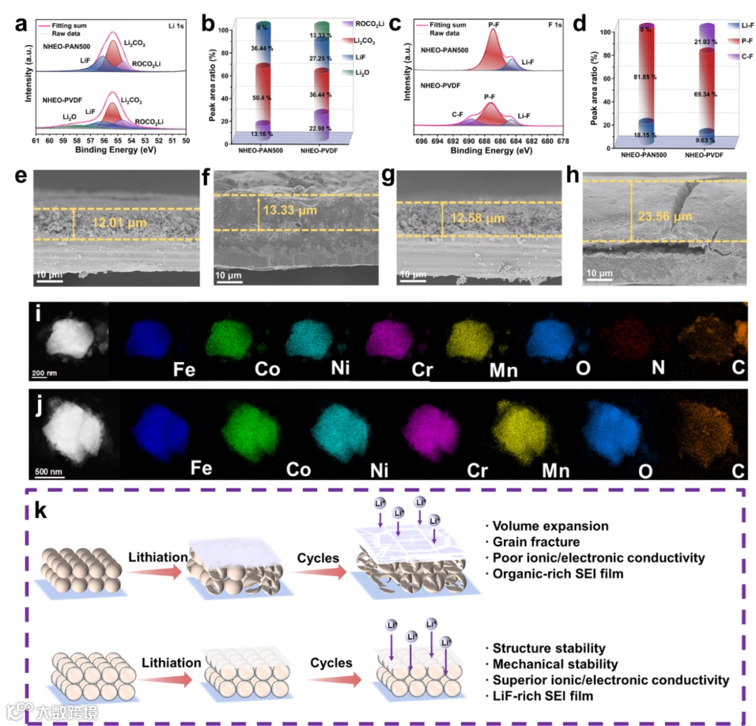 图7. (a-d) 100次循环后NHEO-PAN500和NHEO-PVDF电极的Li 1s和F 1s HRXPS光谱。电极循环前后的横截面SEM图像:(e, f) NHEO-PAN500和(g, h) NHEO-PVDF电极。100次循环后(i) NHEO-PAN500和(j) NHEO-PVDF电极的STEM HAADF图像及其对应的EDS元素映射。(k) NHEO-PAN500和NHEO-PVDF电极在循环过程中表面变化的示意图。