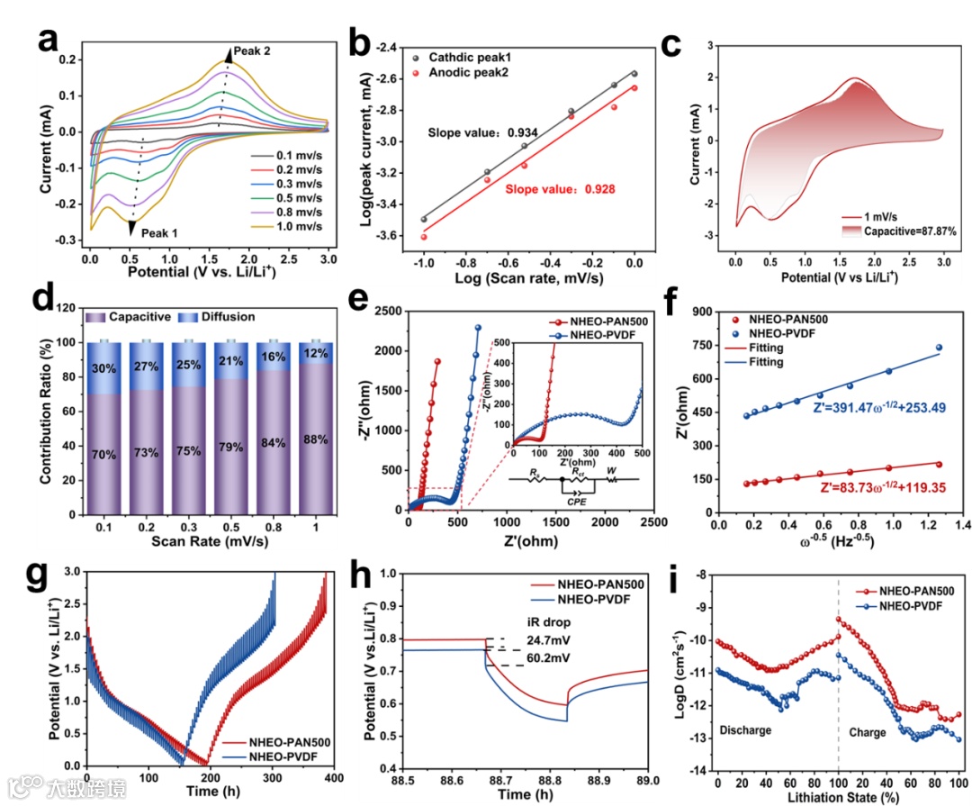 图4. (a) 不同扫描速率(0.1-1.0 mV s-1)下的CV曲线,(b) log(v)与log(i)的线性拟合,(c) 在1 mV s-1下的CV曲线图,显示NHEO-PAN500的电容贡献,(d) NHEO-PAN500在不同扫描速率下的电容控制容量贡献。(e) EIS图,(f) 低频区域内Z'与ω− 1/2(ω = 2πf)的关系曲线,(g) GITT曲线,(h) 锂化过程中的典型GITT图,(i) 计算得到的NHEO-PAN500和NHEO-PVDF的Li+扩散系数数据图。