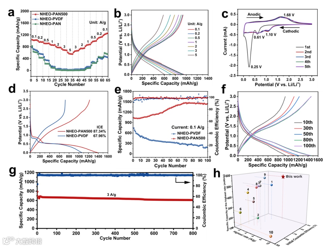 图3. 电化学性能。(a) 不同电极的倍率性能。(b) NHEO-PAN500在不同倍率下的充放电(锂化/脱锂)曲线。(c) NHEO-PAN500电极的CV曲线。(d) NHEO-PAN500和NHEO-PVDF电极的首次充放电曲线和(e)在0.1 A g-1下的循环稳定性。(f) NHEO-PAN500在0.1 A g-1下不同循环次数的充放电曲线。(g) NHEO-PAN500在3 A g-1下的长循环性能。(h) NHEO-PAN500与其他报道的高熵氧化物基负极的电化学性能比较。