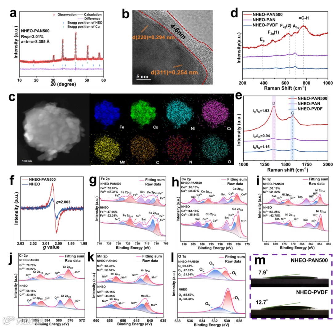 图2. (a) NHEO-PAN500的精修XRD图谱。(b) NHEO颗粒上cPAN涂层的HRTEM图像。(c) NHEO-PAN500的STEM HAADF图像及其对应的元素映射图像。(d, e) NHEO-PVDF、NHEO-PAN和NHEO-PAN500的拉曼光谱。(f) NHEO-PAN500和NHEO的EPR图像。NHEO-PAN500电极和NHEO粉末的HRXPS光谱:(g) Fe 2p,(h) Co 2p,(i) Ni 2p,(j) Cr 2p,(k) Mn 2p,(l) O 1s。(m) NHEO-PAN500和NHEO-PVDF电极的电解质润湿性。