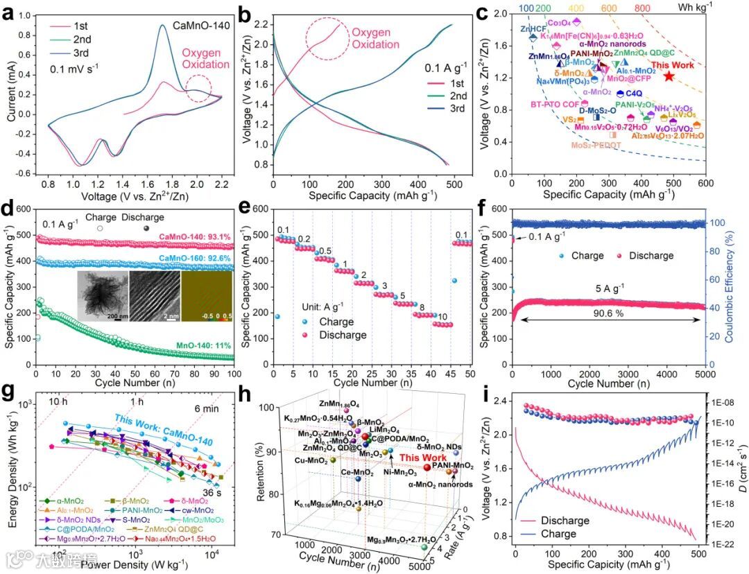 图2:电化学性能。CaMnO-140电极在a)0.1 mV s–1下的CV曲线和b)0.1 A g–1下的充放电曲线;c)与其他先进AZIBs正极材料的能量密度比较;d)MnO-140、CaMnO-140和CaMnO-160在0.1 A g–1下的循环性能;插图显示了100次循环后CaMnO-140的TEM和HRTEM以及相应的几何相分析图像;e)倍率性能,f)长循环稳定性;g、h)CaMnO-140电极与已报道的MnO2基正极(基于Zn2+/H+插入/提取机制)的对比;i)CaMnO-140在0.1 A g–1下的GITT曲线和相应离子扩散系数。