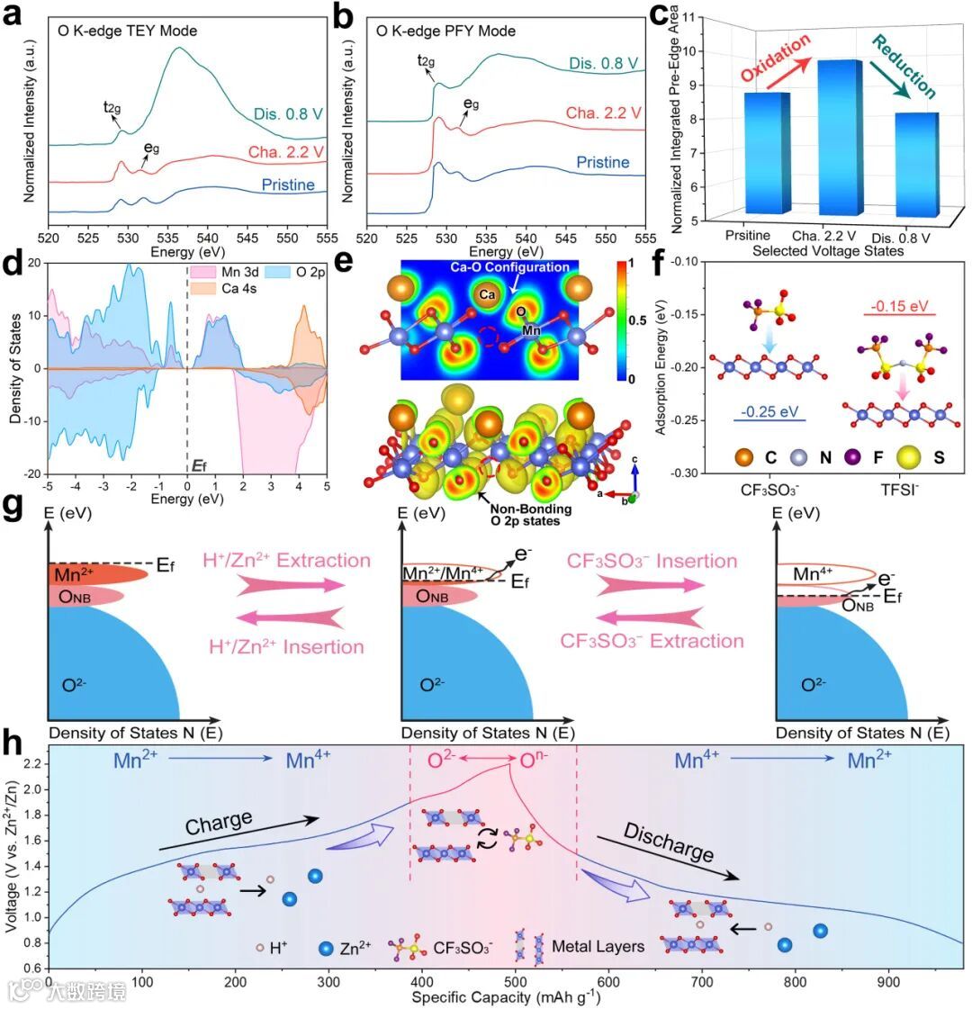 图4:同步辐射表征和DFT计算。CaMnO-140在a)TEY、b)PFY模式下的非原位O K边sXAS光谱以及对应的c)边前区域(526.8-533.3 eV)的积分演变;d)CaMnO-140的pDOS图、e) ELF图和ELF等值面图;f)CF3SO3−和TFSI−嵌入CaMnO-140的吸附能;CaMnO-140充放电过程中的g)能级结构演变和h)反应机理示意图。