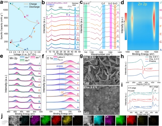 图3:CaMnO-140正极的反应机理。a)0.1 A g–1下的充放电曲线(标记点用于非原位测试);非原位b)XRD、c)FTIR、d)Zn 2p、e)Mn 2p和f)O 1s XPS光谱图;g)放电至0.8 V和充电至2.2 V时电极的SEM图;非原位h)EPR、i)O K边和Mn L边EELS能谱图;j)完全充电/放电的STEM-EDS Mapping图。