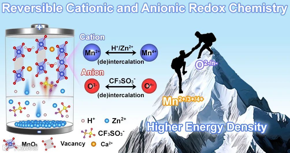 水系锌离子电池(AZIBs)由于理论容量高、安全性高、成本低廉、环境友好而受到广泛关注,但缺乏能够高效、稳定、快速储锌的先进正极材料。因此,开发高比能、长寿命正极材料是推进水系锌离子电池应用的关键之一。层状二氧化锰(δ-MnO2)具有成本低廉,储锌容量和工作电压相对较高等诸多优势被认为是极具前景的储锌正极材料。目前,δ-MnO2基正极的储能机制主要为H+/Zn2+共嵌入/脱出与MnO2/Mn2+的溶解/沉积,改性策略主要聚焦于结构设计(如微纳工程、插层工程、导电杂化设计、异质掺杂、缺陷工程)和电解液、沉积基底优化,在反应机理方面鲜有提出新见解。阴离子(O2-)氧化还原反应在锂/钠离子电池层状氧化物正极材料中已经取得了较为深入的研究,在高电压区可以提供额外的可逆容量,但在水系Zn-MnO2电池体系中尚未被报道。因此,激活MnO2正极中的阴离子氧化还原反应,实现阴/阳离子协同氧化还原化学,将Zn-MnO2电池的能量密度提升到一个新的水平具有重要意义但也充满挑战。
