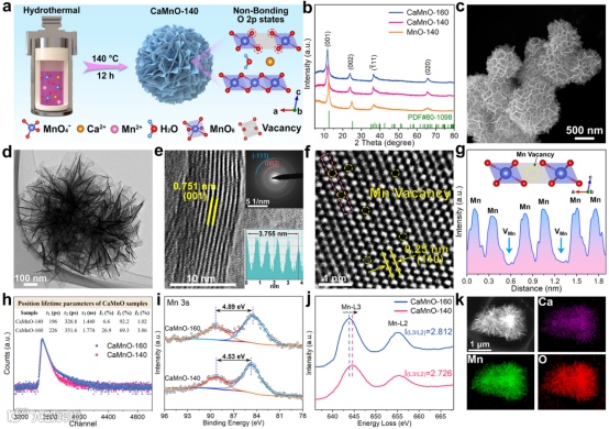 图1:结构和形貌分析。a)CaMnO-140微纳球的合成示意图;b)MnO-140,CaMnO-140和CaMnO-160的XRD谱图;CaMnO-140的c)SEM图、d)TEM图、e)HRTEM和SAED图、f)HAADF-STEM图与g)从f)中的红色区域提取的强度线轮廓图;CaMnO-140和CaMnO-160的h)PALS和对应寿命参数(插图),i)Mn 3s XPS光谱,j)Mn L边EELS光谱;k)CaMnO-140材料的STEM-EDS图。