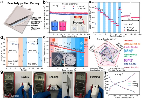 图5:可充电软包锌离子电池。a)CaMnO-140//Zn软包电池示意图;b)不同正极负载下的循环性能;插图显示了由两个软包电池串联点亮LED灯的照片;c)倍率性能和循环稳定性,d)软包电池自放电性能,e)宽温域性能;f)与最近报道的二氧化锰基正极的电化学性能对比雷达图;g)软包电池弯曲和穿孔实验及h)相应的充放电曲线。
