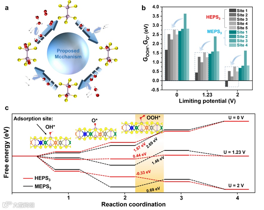 由于高熵系统建模的复杂性,为了探索高熵材料HEPS3近乎无穷的构型空间,选取了60个独特的高熵结构表面并涵盖了300个不同的P活性位点,最终确定了潜在的表面构型。建立了可能的四质子转移步骤机理,在所有的电压范围内,HEPS3(001)上的P活性位点相对于MEPS3(001)都表现出较低的吉布斯自由能势垒。高熵效应和Zn的引入优化了P在关键中间体的吸附能,降低了OER最大限速步骤。