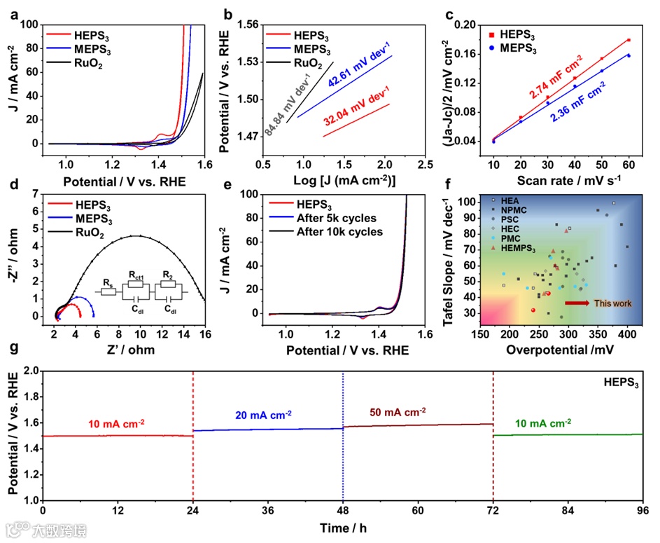 在1 M KOH溶液中,HEPS3只需240 mV 的过电位就能获得10.0 mA cm-2的电流密度, 明显高于中熵MEPS3催化剂和商业催化剂RuO2(10.0 mA cm-2的过电位分别为266和278 mV)。HEPS3具有优异的析氧稳定性。在1 M KOH溶液中,在连续10mA cm-2、20mA cm-2、50mA cm-2和10mA cm-2电流密度下, HEPS3作96小时以上,无明显性能下降。同时,该样品可CV循环10000圈仍无明显衰减。