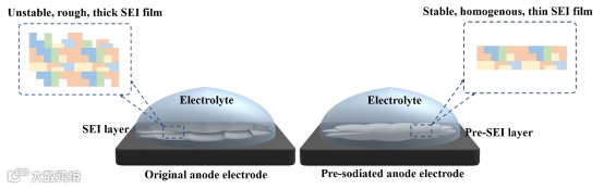 图2、原始电极和预钠化电极表面SEI形貌和结构对比示意图