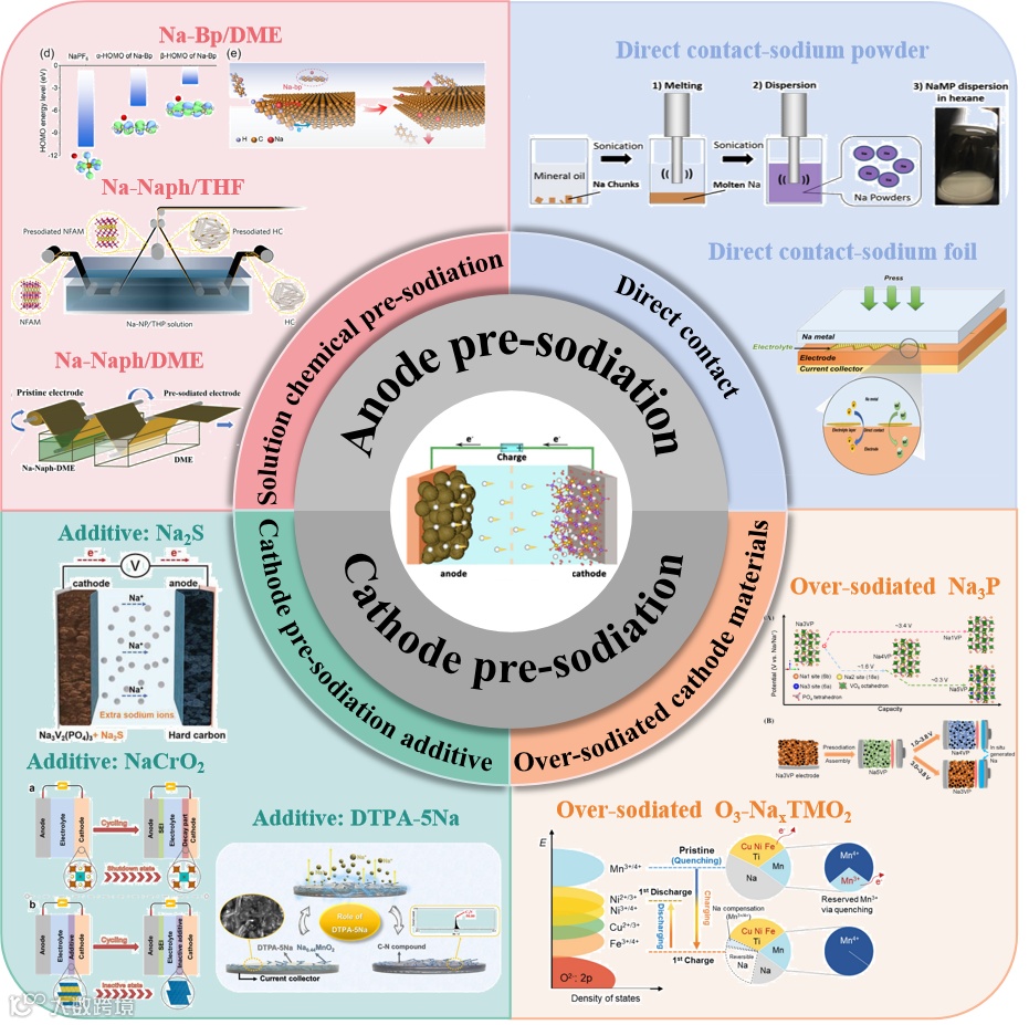 负极预钠化是在电池初始循环前直接向负极补充额外活性钠的一种策略。根据作用机制,负极预钠化可分为直接接触法和溶液化学预钠化。