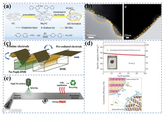 意义:预钠化技术在提高负极材料的ICE和全电池系统的循环寿命方面发挥着关键作用。预钠化的作用主要分为三个方面:1)有效补偿了初始循环中活性钠的损失,这是预钠化技术的关键所在。2)在预钠化过程中形成的预 SEI 钝化层增强了界面稳定性,有利于随后形成致密的SEI层。3)预钠化技术提高了电池的长循环稳定性和能量密度。