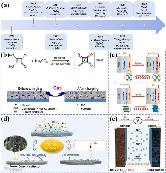 目前,正极预钠化技术因其操作简单、成本低廉、效果显著而备受关注。正极预钠化的主要方法包括添加自牺牲正极添加剂和使用富钠正极材料。前一种方法需要添加含钠添加剂,这些添加剂在初始充放电过程中会发生电化学氧化,不可逆转地释放出额外的钠离子,以补偿钠的损失。迄今为止,已报道的正极添加剂约有10种,包括Na2C2O4、DPTA-5Na、Na2S、NaNO2、NaCrO2、Na2NiO2、Na2C4O4、NaN3。