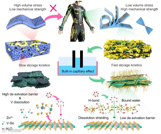 对于传统的PVDF基电极来说,其结构聚团性和较差的润湿性往往导致其体积应力大,机械强度低,活性成分利用率低,储存动力学缓慢。相比而言,利用BC介质的三维网状结构、高机械强度、良好的吸水性和保水性之间的多功能作用,设计相应的自组装膜可以实现对电解质渗透性差、水合锌离子与主体之间强静电相互作用、钒溶解失控以及电极内部应力-应变效应大等问题的综合调控。其中,BC与碳纳米管结合形成互联的三维导电网络,全方位紧密包裹活性材料,增加了接触面积,从而大大提高了活性组分的利用率,降低了界面电阻。然后,其刚性力学性能支撑其三维空间结构,具有较高的拉伸和压缩力学性能,整个电极可以弯曲、折叠和扭曲而不会造成电极开裂。最后,富羟基修饰的BC骨架可以激发内置的毛细管效应,自发吸附水分子并将其保留在电极-电解质界面,从而优化水合锌离子的脱溶,减弱水合锌离子与主体材料的强相互作用,屏蔽钒的逃逸溶解。