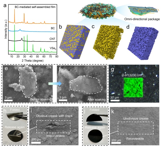 图2. a)VSe2、CNT、BC和BC介导的自组装膜的XRD图案;b-d)BC介导的自组装膜的3D重建体积;e)浸泡前的FESEM图像;(f)浸泡后的FESEM图像;g)BC介导的自组装膜的拉曼图谱;h)PVDF基电极的数字图片;i)折叠添加PVDF的电极后的FESEM图像。j)BC介导的自组装膜的数字图像;k)BC介导的自组装膜折叠后的FESEM图像。
