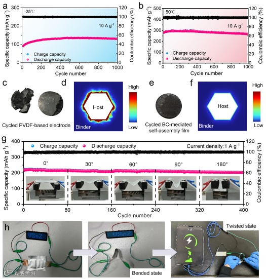 图6. a)BC介导的自组装膜在10 A g-1和-25 °C下的循环性能;B)BC介导的自组装膜在10 A g-1和50 °C下的循环性能;c)循环后PVDF基电极的数字图像;d)PVDF基电极的应力分布模拟;e)循环后BC介导的自组装膜的数码照片;f)BC介导的自组装膜应力分布的模拟;g)在1 A g-1下,不同弯曲角度的柔性软包电池的电化学性能。h)在原始和弯曲状态下由柔性电池驱动的具有“VSe2”图案的LED和在扭曲状态下由柔性电池充电的10. 9英寸iPad。