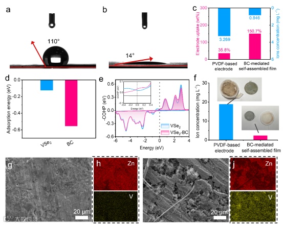 图5.a)PVDF基电极和B)BC介导的自组装膜的接触角;c)PVDF基电极和BC介导的自组装膜对电解质的吸收和相应的钒离子;(d)VSe2和VSe2-BC对H_2O的吸附能;e)VSe2和VSe2-BC的COHP曲线;f)ICP-OES测试:循环50次后BC介导的自组装膜和PVDF基电极的溶解钒含量;BC介导的自组装膜匹配的Zn阳极的g)非原位SEM图像h)的EDS图像;与PVDF基电极匹配的Zn阳极的i)非原位FESEM图像j)EDS图像。