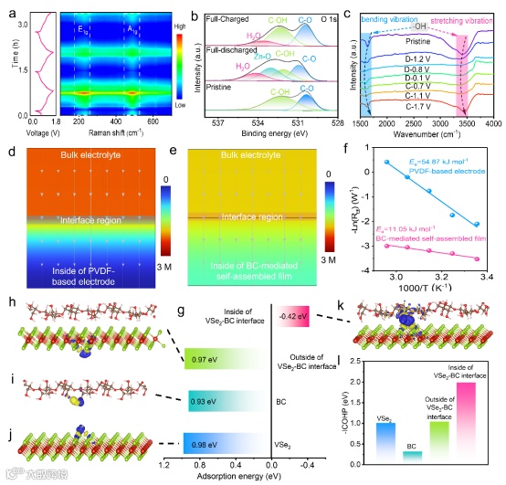 图4 a)BC介导的自组装膜的原位拉曼光谱;B)O 1 s的高分辨率XPS谱;c)各种充电/放电状态下的非原位FTIR光谱;从电解质到d)PVDF基电极和e)BC介导的自组装膜电极的电极的浓度场分布;f)BC介导的自组装膜和PVDF基电极的Arrhenius活化能;g)VSe2、BC、VSe2-BC界面外和VSe2-BC界面内对Zn原子的吸附能;h)Zn原子在VSe2-BC界面外的电荷密度分布,i)Zn原子在BC界面外的电荷密度分布,(j)Zn原子在VSe_2-BC界面内的电荷密度分布,k)Zn原子在VSe2-BC界面内的电荷密度分布;(1)VSe2、BC、VSe2-BC界面外和VSe2-BC界面内对Zn原子的ICOHP值。