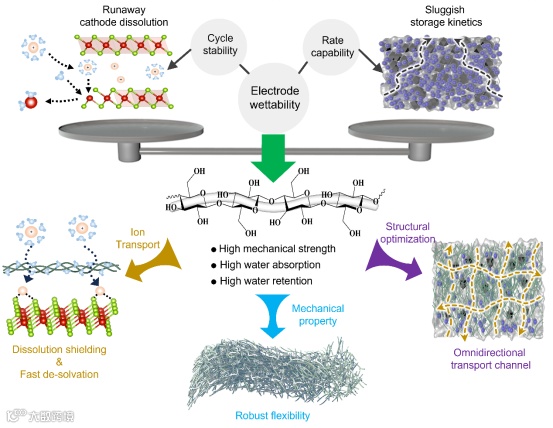 图1. 提出了细菌纤维素(BC)介导的润湿性工程的概念图,以平衡水溶液锌离子电池电极的失控溶解和储存动力学。