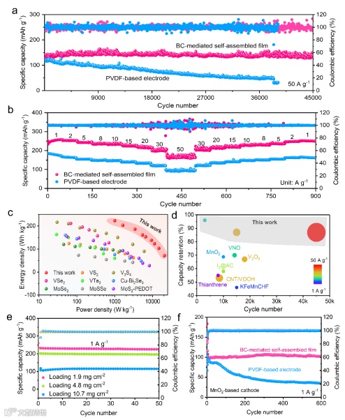 图3 a)50 A g-1下的长期循环性能,b)1-50 A g-1时的倍率性能,c)BC介导的自组装膜与先前报道的用于水性锌离子电池的TMD阴极相比的Ragone图,d)BC介导的自组装膜与先前报道的阴极在循环寿命和容量保持率方面的比较,e)BC介导的自组装电极在1 A g-1下的不同负载的循环性能,f)MnO2@CNT基电极在1 A g-1下的循环性能。