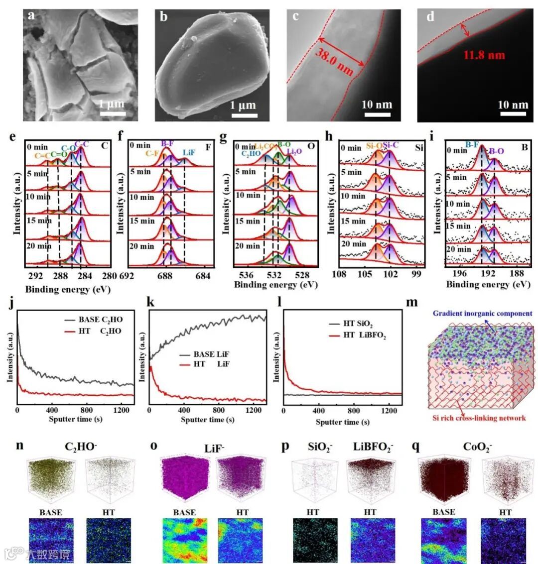 为了明确HT电解液及BASE电解液在高温下CEI膜结构及成分的差异,采用SEM、TEM、XPS等测试LiCoO2正极界面进行分析。从SEM及TEM图像可以明显发现,相对于HT电解液,在80°C温度下,循环100圈后BASE电解液中的LiCoO2正极颗粒明显开裂,且形成了38nm厚的不均匀CEI膜。从XPS测试可以看到,PTSE(图4h)及LiODFB(图4i)均参与了CEI膜的形成,且与BASE电解液及1PTSE电解液不同,随着时间的推移,HT电解液中的LiF含量逐渐减少,意味着在高温下,BASE及1PTSE两种电解液中的LiPF6持续分解,而HT电解液由于ODFB-的成膜效果突出,在高温下形成更加稳定界面,有效抑制电解液持续分解。从TOF-SIMS可知,HT电解液形成的CEI中的电解液溶剂分解产物C2HO,的含量远小于BASE电解质中的含量,这表明在HT电解液中溶剂的过度分解得到了抑制。