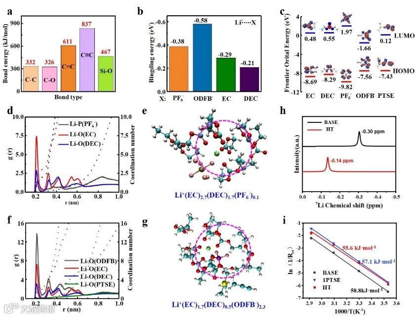 通过密度泛函理论(DFT)计算可知,Li+-ODFB-的结合能(-0.58eV)远小于Li+-PF6-的结合能(-0.38eV),说明在LiODFB基电解液(HT电解液)中,EC或DEC的溶解能力较弱于LiPF6基电解液(BASE电解液、1PTSE电解液),从而形成弱溶剂化电解液,此外,含有不饱和C≡C和高键能Si-O的PTSE作为添加剂通过表面聚合作用,PTSE演化成耐热交联聚合物(聚碳硅烷)。通过分子动力学模拟(MD)及NMR进一步可知,相对于LiPF6基电解液,在LiODFB基电解液中,更多的阴离子参与Li+的溶剂化结构中,为弱溶剂化电解液。