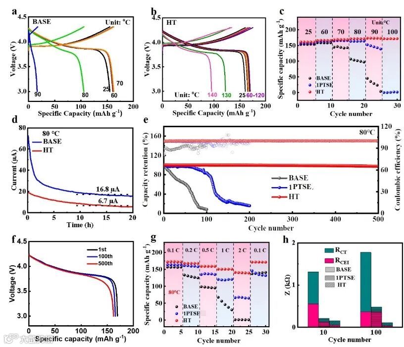 将BASE、1PTSE、HT三种电解液分别组装成LiCoO2||Li电池,探究其高温下电化学性能及与LiCoO2正极材料的兼容性。可以明显看到,在不同温度下,HT电解液的综合性能均优于其他两种电解液,特别是在80 °C下,HT电解解液在保持高容量的同时,500圈后的容量保持率高达96.1%,且在高倍率电流后,容量并未衰减,意味着其在高温下仍然具有良好可逆性。此外,相较于室温下,BASE电解液在80 °C出现了明显容量衰减,而HT电解液在120 °C仍能保持超高的比容量,其极限温度远高于BASE电解液。