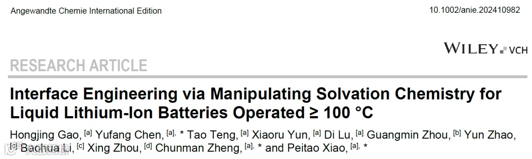 面对装备对高温锂离子电池的需求,针对液态锂离子电池在极端高温下容量衰减快等问题,本工作以理论计算和分子模拟为指导,设计新型耐高温弱电解液,并构筑了具有独特结构的有机-无机杂化界面,从而实现液态锂离子电池在≥100℃高温下稳定工作。相关工作以Interface Engineering via Manipulating Solvation Chemistry for Liquid Lithium‐Ion Batteries Operated ≥ 100 °C为题发表在国际高水平期刊Angewandte Chemie International Edition上(中科院1区Top)