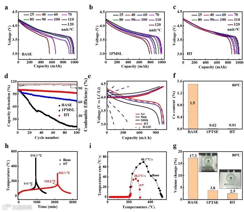 为了评估HT电解液在高温场景下的实际应用潜力,将上述三种电解液组装成Ah级LiCoO2||石墨全电池,并从其在不同温度下(25 °C-120 °C)的电化学性能,80 °C的循环性能,及产气,金属溶解等多个方面进行分析可以确定,在高温下,相较于常规电解液(BASE),HT电解液可以保持高电化学性能的同时,具有良好的安全性能。