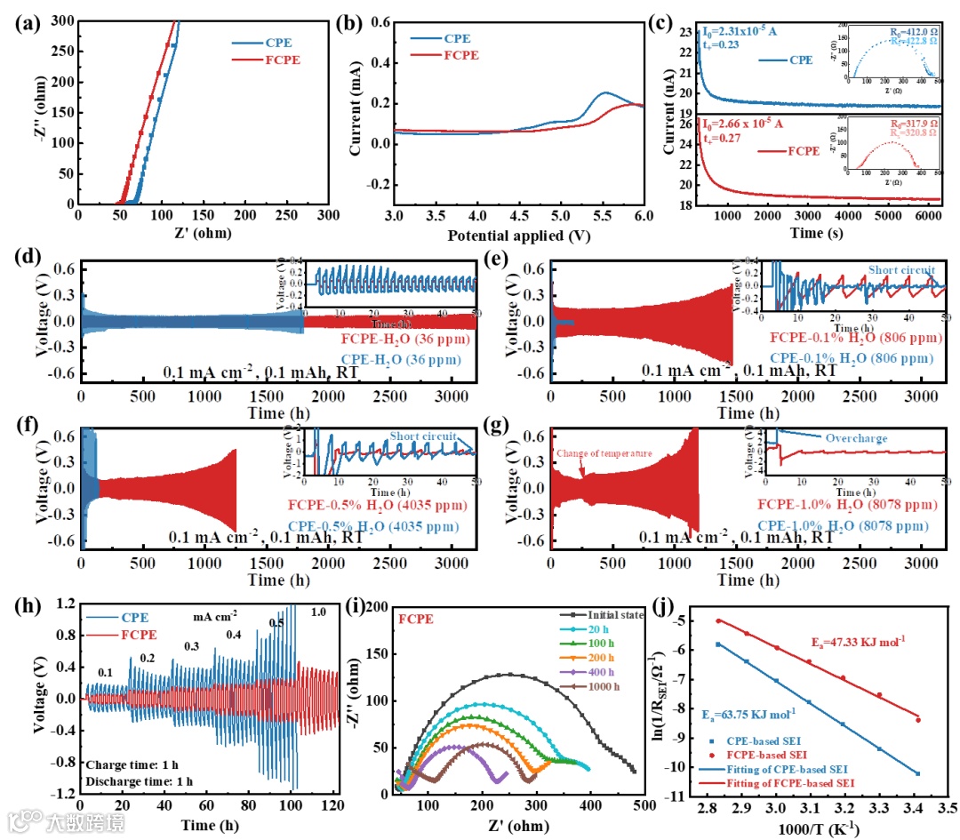图4 使用FCPE的Li‖Li对称电池的电化学性能。a) FCPE的电化学阻抗谱(EIS)图。b)使用FCPE的电池的LSV曲线。c)使用FCPE的Li‖Li对称电池的直流极化曲线。d)-g)在0.1 mAcm-2下,使用不同浓度H2O电解质的Li‖Li对称电池的循环稳定性。h)电流密度从0.1到1.0 mA·cm-2范围内,Li‖Li对称电池的倍率性能。i)带有FCPE的Li‖Li对称电池在不同循环下的EIS。j)通过阿伦尼乌斯方程拟合不同温度(20到80 ℃)下的RSEI,得到离子扩散通过SEI的活化能。