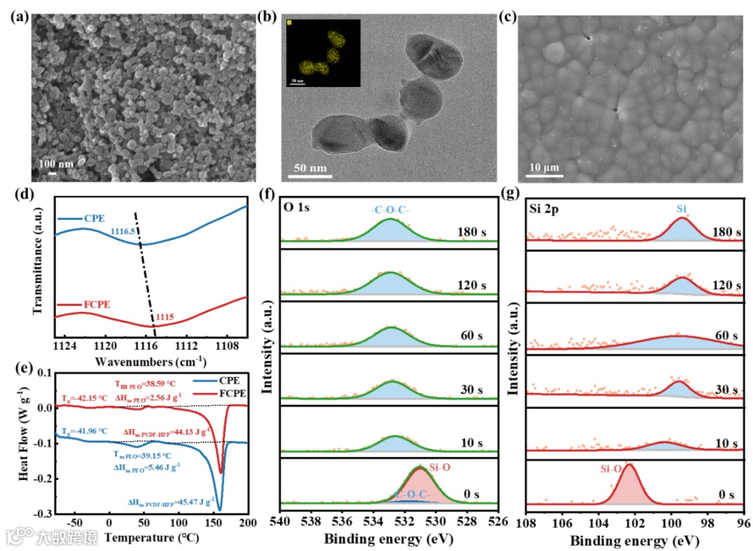 图 2 FCPE 的表征。a) Si 纳米粒子的 SEM 图像。b) Si 纳米粒子的 TEM 图像和 EDS 映射。c) FCPE 的 SEM 图像。d) CPE 和 FCPE 的 FT-IR 光谱。e) CPE 和 FCPE 的 DSC 分析。f)-g) FCPE 的 O 1s 和 Si 2p XPS 光谱。