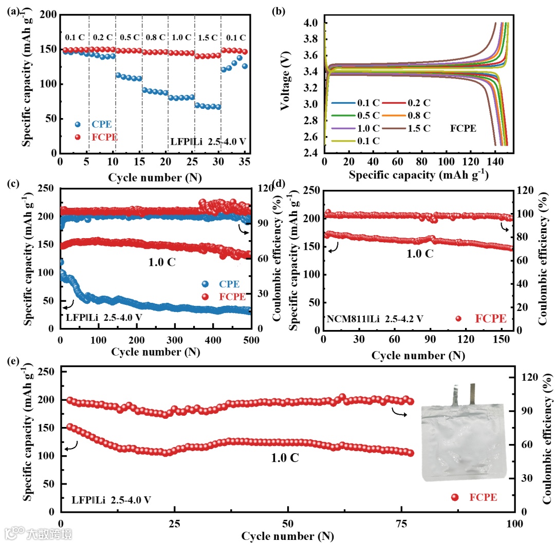 图6 采用CPE和FCPE的LFP‖Li电池的电化学性能。a) 采用CPE和FCPE的LFP‖Li电池的倍率性能(1 C 充电和增加放电速率)。b) 采用FCPE的LFP‖Li电池在不同速率下的充电和放电电压曲线。c) 采用CPE和FCPE的LFP‖Li电池的循环性能。d) 采用FCPE的NCM811‖Li电池的循环性能。e) 采用FCPE的LFP‖Li软包电池的循环性能。