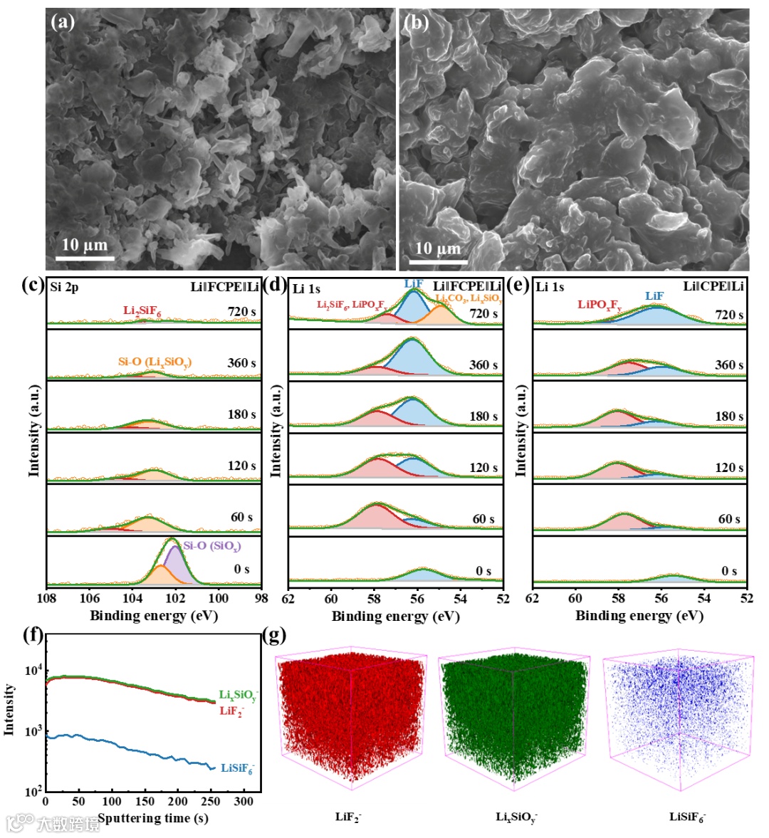 为了分析使用FCPE电池的优异电化学性能的原因,通过SEM观察了锂金属表面形貌。结果显示,使用FCPE时锂金属表面没有锂枝晶,而使用CPE时在循环后出现了锂枝晶。此外,FCPE电池中的锂金属横截面比CPE电池中的更平整。XPS分析表明,FCPE电池中的锂金属表面形成了含有LiF、LixSiOy、Li2SiF6、Li2CO3和LiPOxFy等成分的SEI层,这些无机物质构成了一个坚固的SEI保护层,增强了锂负极的稳定性。TOF-SIMS进一步表征了SEI层的化学组成和微观结构,显示出LiF2-、LixSiOy-和LiSiF6-碎片从外层到内层逐渐减少,尤其是LiF2-丰富,表明SEI层中存在丰富的无机物质。实验还验证了Li2SiF6的作用,发现添加Li2SiF6的CPE电导率提高,循环性能稳定。总结来看,FCPE通过去除电池内微量的H2O和HF,形成了稳定的SEI层,从而提高了电池的电化学性能。
