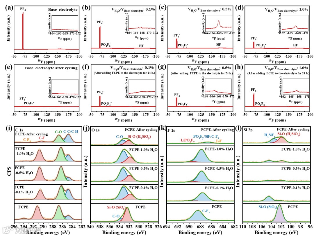 图3 FCPE的除杂性能表征及除杂后表面组分分析。a)-d)不同H2O含量的基础电解液储存24h后的19F NMR谱。e)电池循环后的基础电解液的19F NMR谱。f)-h)将FCPE加入到储存24h的电解液中,得到不同H2O含量的基础电解液的19F NMR谱。i)-l) FCPE的C 1s(i)、O 1s(j)、F 1s(k)和Si 2p(l) XPS谱。