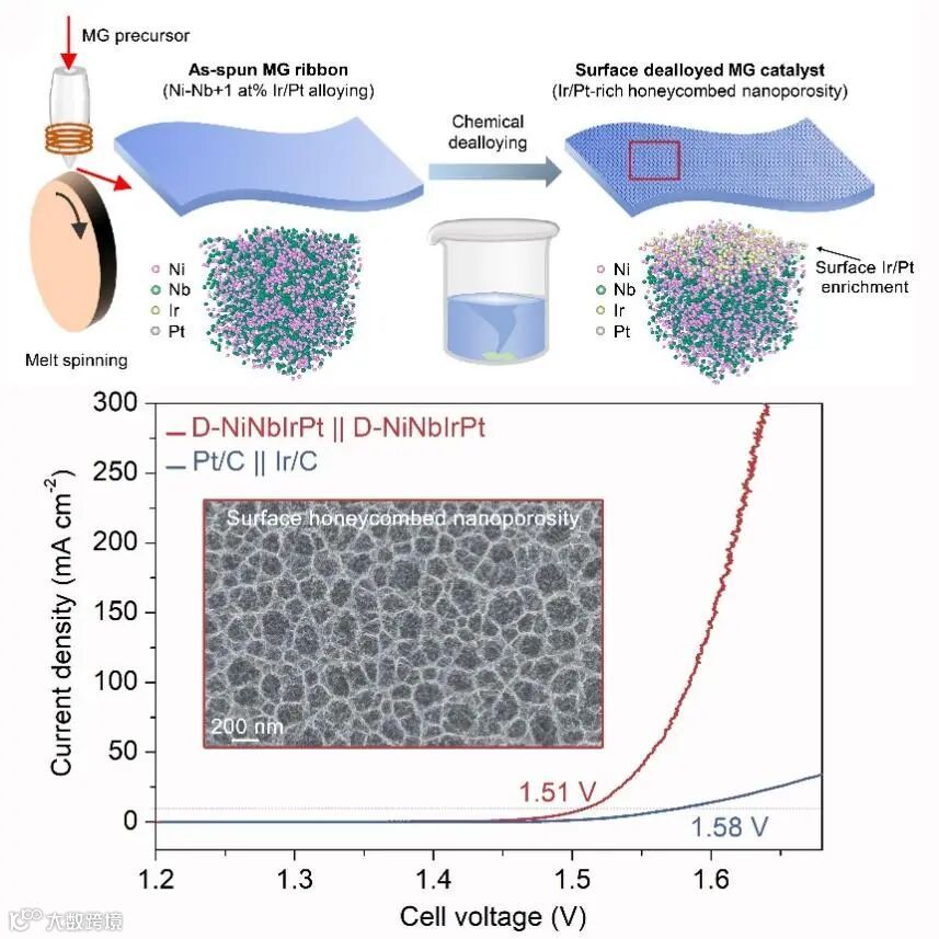 将少量 Ir 和 Pt(≤1 at.%)合金化到Ni-Nb 非晶合金体系中,并通过简单的脱合金工艺在非晶衬底上制造具有富 Ir 和Pt蜂窝状纳米孔特性的独特催化剂结构,其表面原子构型从亚稳态(无定形)转变为相对稳定的态(结晶态),最终形成富含Ir和Pt的自组装纳米晶活性结构。