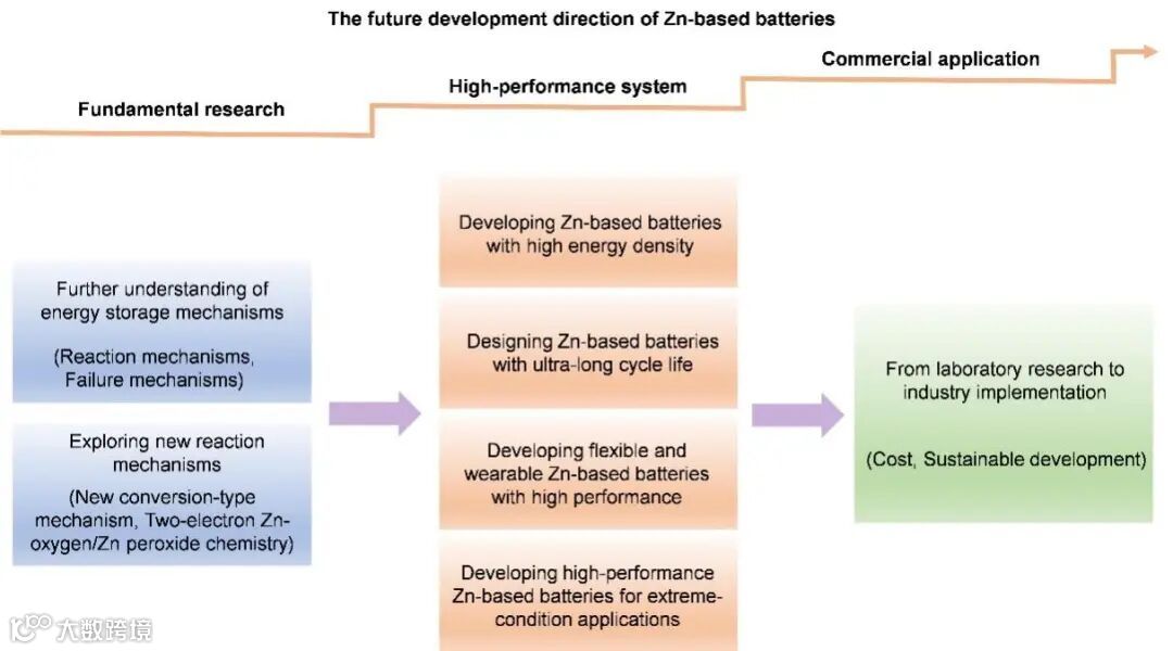 尽管锌基电池已经取得了显著发展,要获得高性能的锌基电池,仍然有许多问题需要解决。由于电池工艺和装置的复杂性,需要投入更多的努力来深入了解锌基电池的反应机理。同时,需要认识到锌基电池的优异性能主要来源于各个组成部分的协同增强,而不是单个组成部分的孤立提高。图2中给出了锌基电池中尚未解决且需要进一步研究和探索的重要领域。