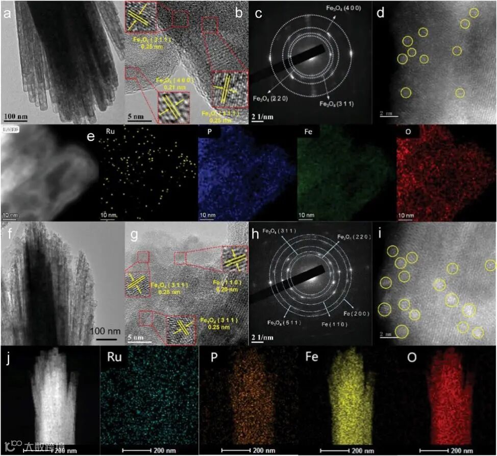 图2. Ru@P-Fe3O4的 (a) TEM图,(b) HRTEM图,(c) SAED图,(d) AC-HAADF-STEM图和(e) HAADF-STEM图及对应的Ru、P、Fe、O的EDX元素映射图;Ru@P-Fe/Fe3O4的(f) TEM图,(g) HRTEM图,(h) SAED图,(i) AC-HAADF-STEM图,(j) HAADF-STEM图及对应Ru P, Fe, O的EDX元素映射图.
