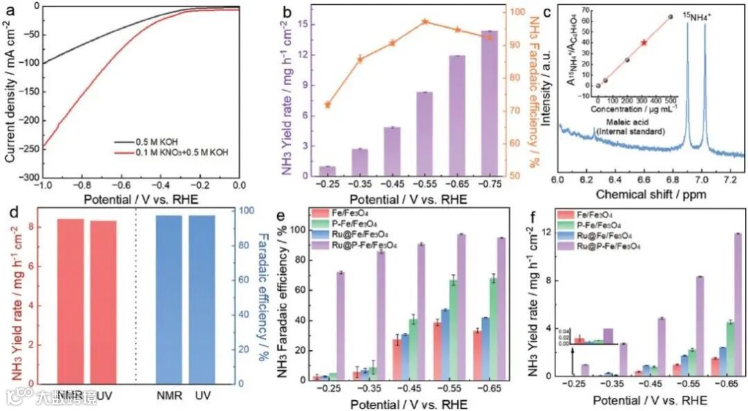 图4.(a)在含和不含0.1 M KNO3的0.5 M KOH电解液中的LSV曲线.(b)各电位下的NH3产率和FEs.(c)0.1 M K15NO3 + 0.5 M KOH电解液中电催化1 h后电解液的核磁共振谱.(d)以15NO3-为氮源,核磁共振和吲酚蓝法定量所得的NO3-RR的NH3产率和FEs的对比.(e)各电位下的Fe/Fe3O4、P-Fe/Fe3O4、Ru@Fe/Fe3O4和Ru@P-Fe/Fe3O4的NH3FEs和产率.